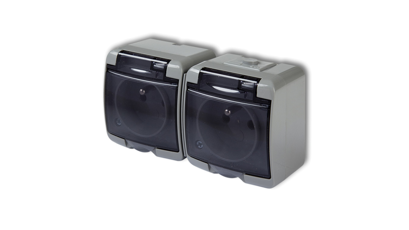 JUNIOR Gniazdo podwójne z/u (klapka dymna) popielaty IP54 10GHE-2d